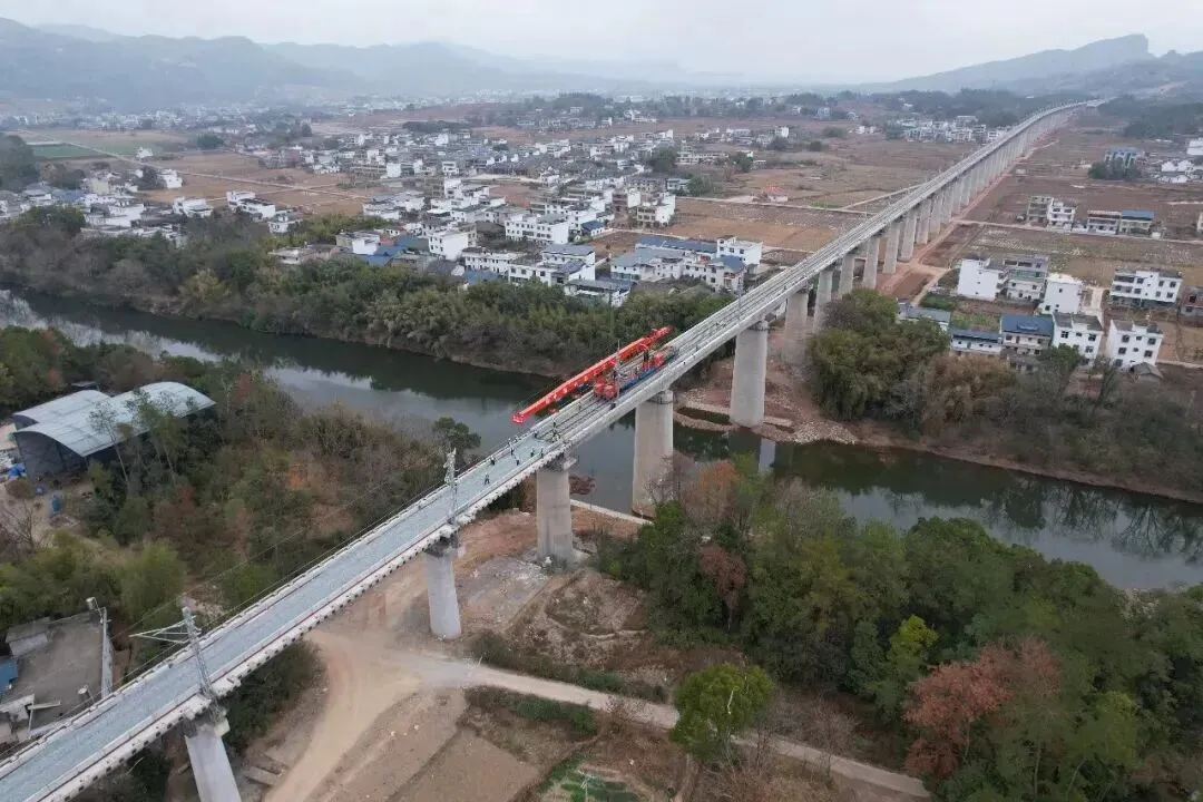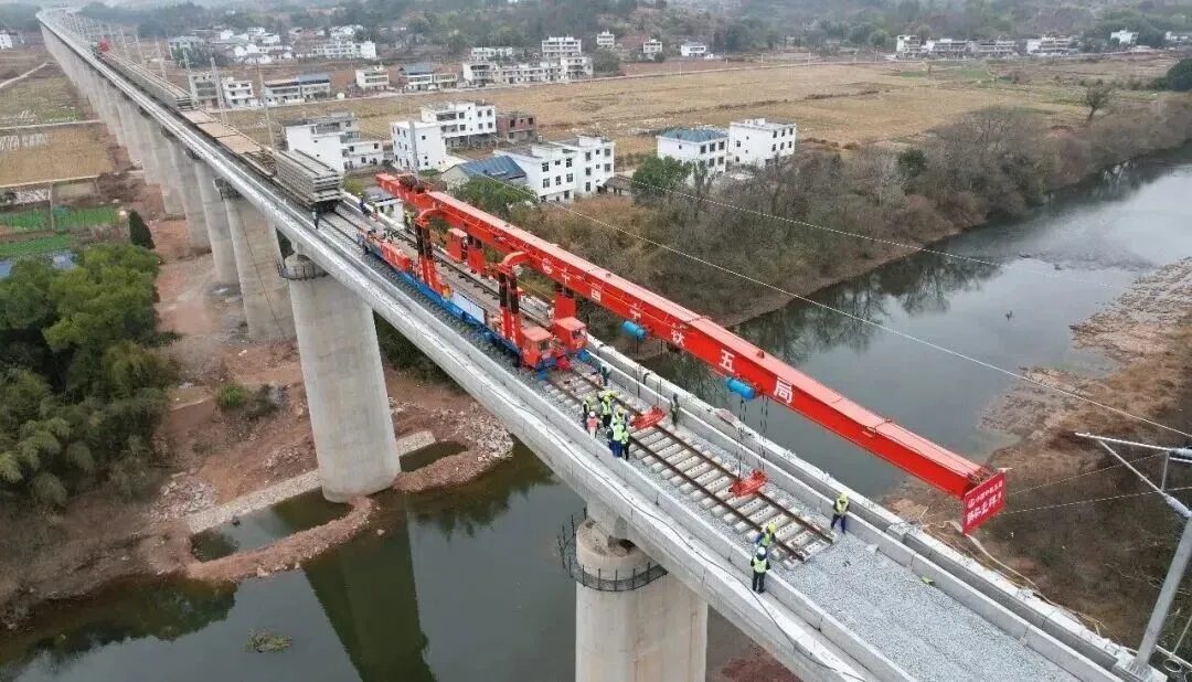 “目前,瑞梅铁路线下主体工程已完成90%以上,线上铺架工程已完成T梁预制475孔,T梁架设371孔,铺轨29km。”中铁五局瑞梅铁路铺架分部党支部书记粟荣富介绍,预计2026年底完成江西段全线182.3公里线路及52组道岔铺设任务。