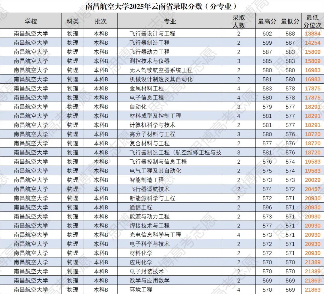 近年来南昌航空大学在云南录取分数上涨的厉害,以王牌专业飞行器设计与工程为例,2023年录取最低位次23174,2024年录取最低位次17436,而2025年已上涨至13884位次。