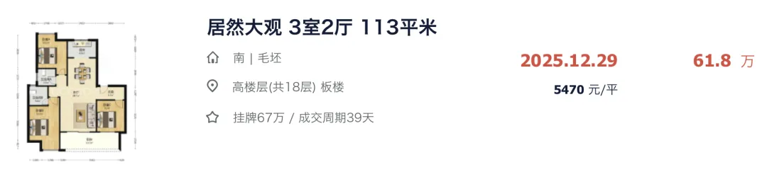 去年 12 月底,小区终于迎来贝壳平台的首套成交。这是一套 113㎡ 三房两卫的高楼层房源,成交总价 61.8 万,毛坯成交单价 5470 元/㎡,成交周期仅 39 天。价格上,这套房源挂牌价为 67 万,仅调价一次就火速成交。