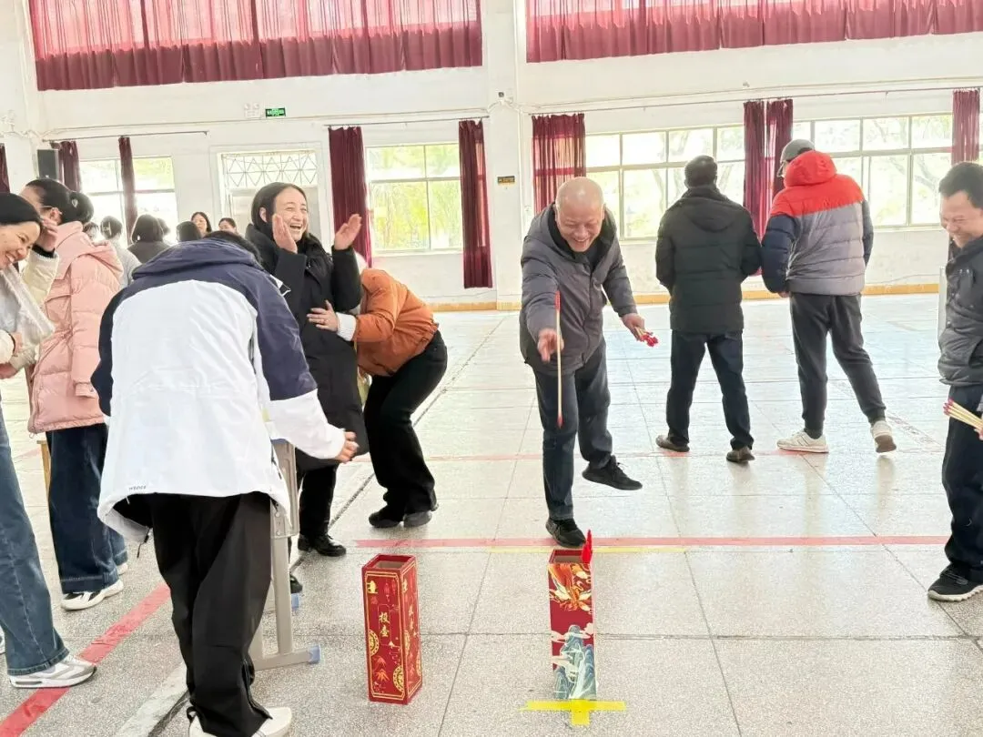 随后,教职工们陆续投入各项趣味项目中。本次游园会共设八大趣味项目,既蕴传统雅趣,亦含运动之乐。在“套圈夺宝”区,只见彩环轻抛,巧落桶间,喝彩声不时响起;“篮式保龄球”前,篮球滚出一道道弧线,瓶倒之时掌声连连;“投球入桶”项目中,一个个网球轻巧入筐,精准之处可见平日匠心。“扔飞镖”靶前,有的凝神屏息,有的洒脱出手,每一次命中都引来欢呼。“猜字谜”角则智慧流转,三言两语间谜底揭晓,会心一笑尽显文趣。“投壶雅趣”颇有古风,箭矢轻投,壶中清脆声响宛如佳音。“原地踏步”与“盲人敲鼓”更是笑点频出,蒙眼游戏中步伐虽有些许凌乱,却掩不住满脸灿烂笑意。