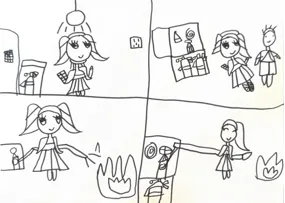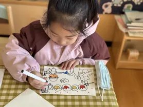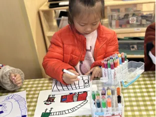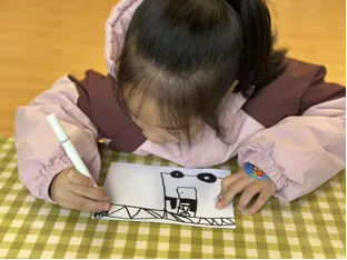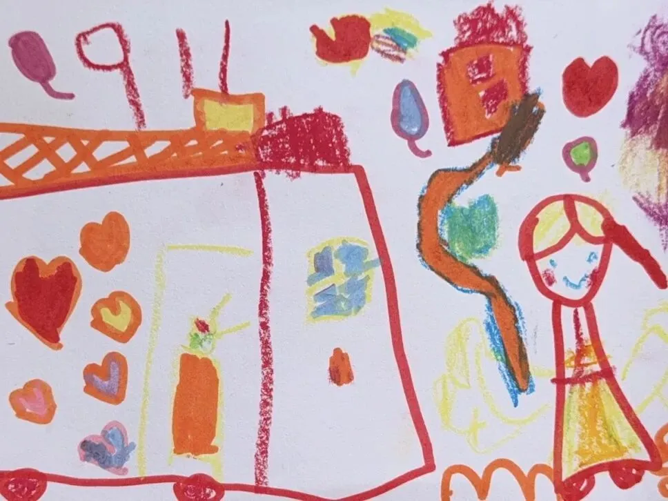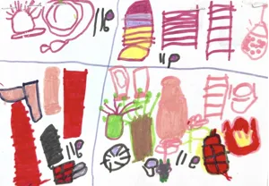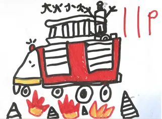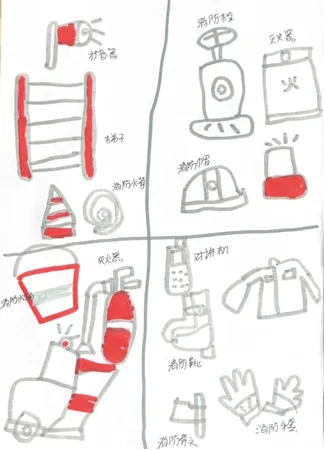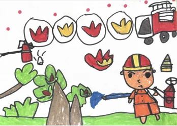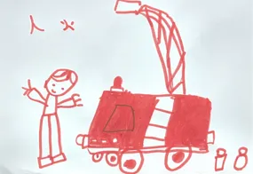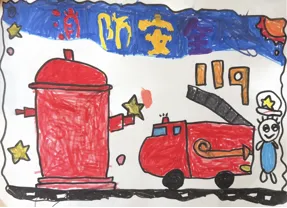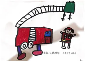从消防队回来以后,小朋友将自己的所见所闻用画笔画下来。