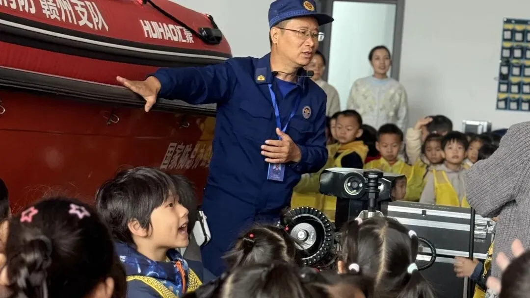 孩子们围着消防皮艇、消防船仔细观察,触摸船体、研究设备,在提问与解答中了解水上消防工具的功能与使用场景。