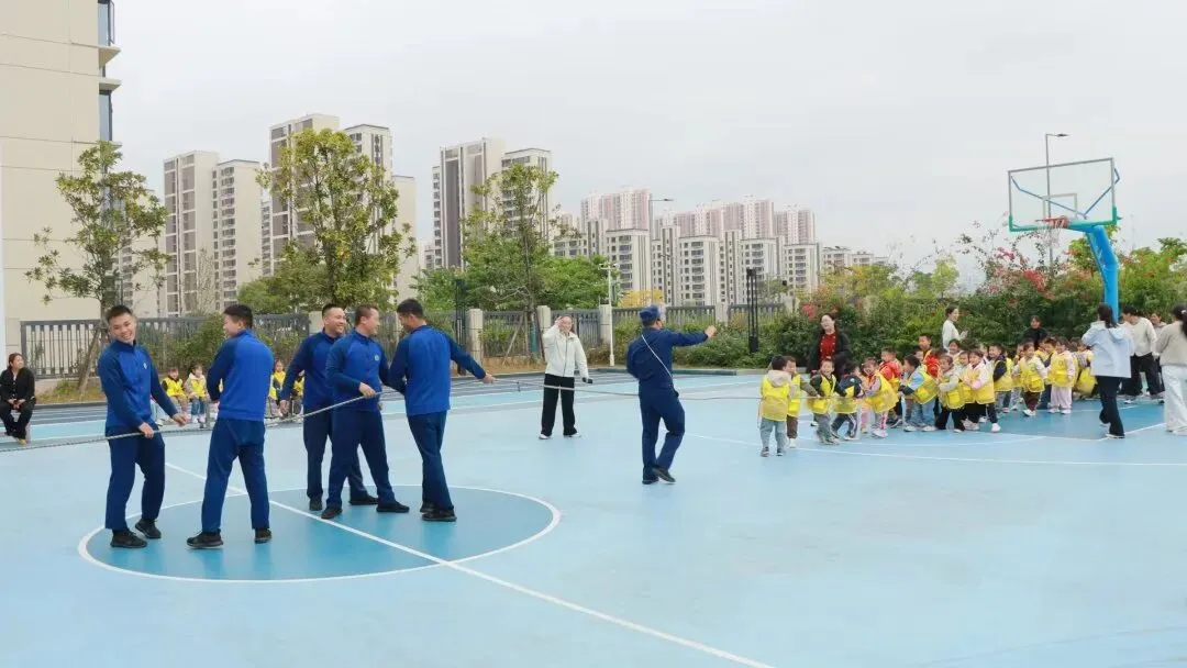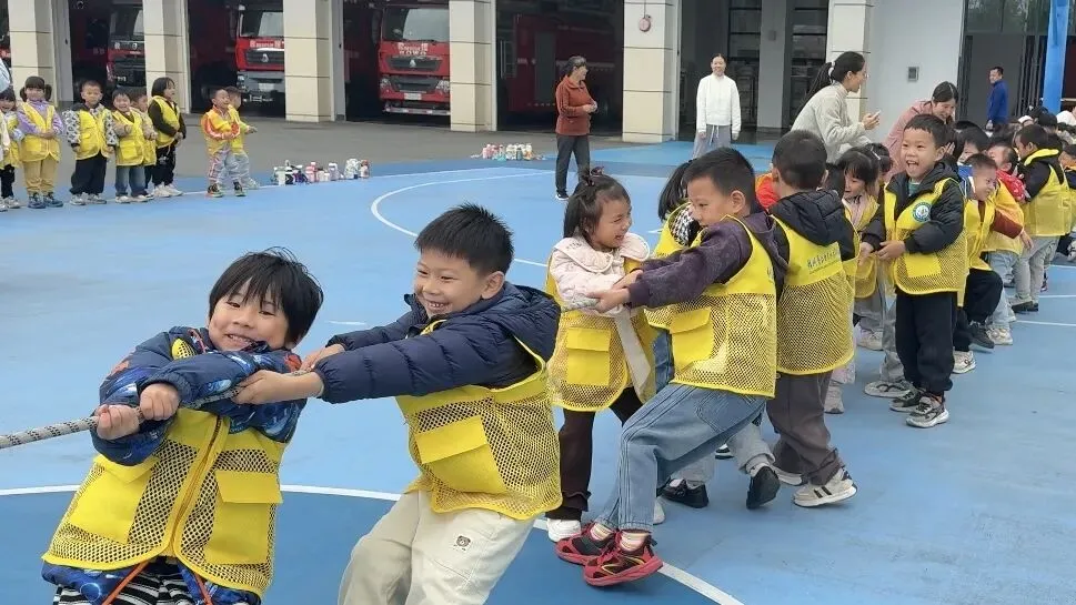 一场趣味拔河比赛拉开序幕,孩子们使出浑身力气与消防员叔叔比拼,欢笑声中拉近了与消防员的距离。