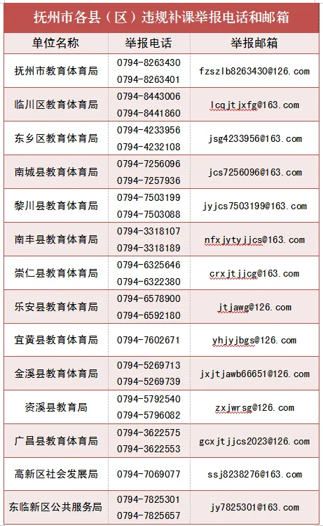 一律不得组织学生集体补课或上新课,一律不得举办学科培训班、特长班、奥赛班、兴趣班、提高班等,一律不得将校园、校舍出租给校外培训机构或与校外培训机构合作举办各类培训班。严禁在职中小学教师组织、推荐和诱导学生参加校内外违规补课,严禁在职中小学教师参加校外培训机构或由其他教师、家长、家长委员会等组织的违规补课,严禁在职中小学教师为校外培训机构和他人介绍生源、提供相关信息。市教体局将在寒假期间开展明察暗访,严肃查处违规补课等行为,对查实的违规学校以及相关负责人、教师,将依法依规严肃处理。现将监督举报方式向社会公布,欢迎广大群众监督并提供问题线索。