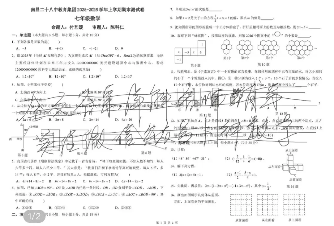 江西省南昌二十八中教育集团2025-2026学年上学期期末测试卷七年级数学