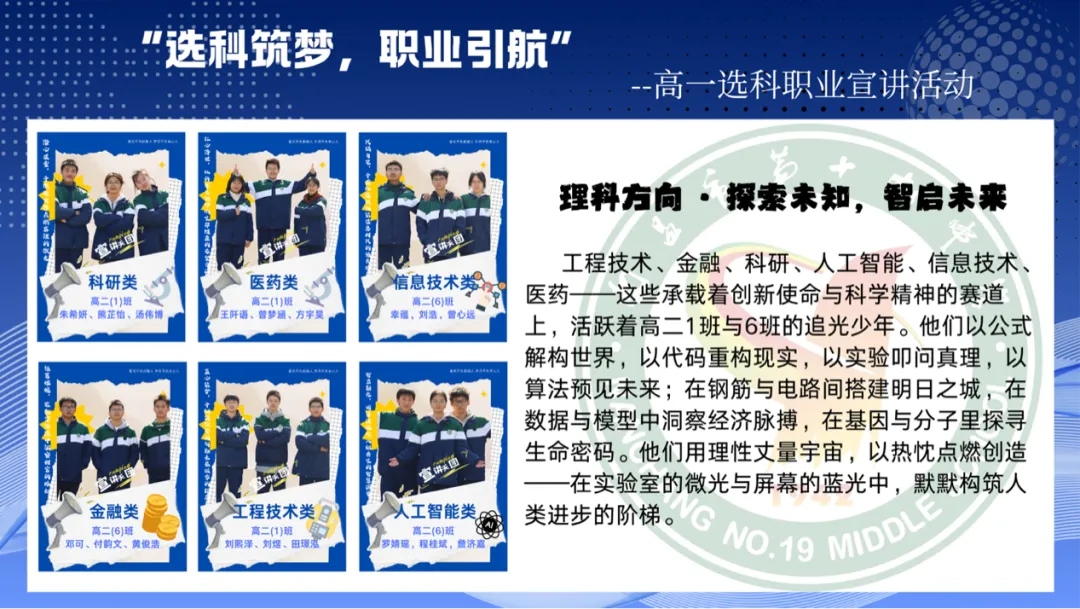 近日,南昌十九中举办“选科筑梦,职业引航”高一选科走班职业宣讲活动,高二年级同学在老师指导下化身“主讲人”,为高一学生选科与职业规划提供指引。活动分文理两场,高二学长学姐围绕11个热门职业类目,结合自身认知与调研分享。他们站在学生视角,从三大核心角度解读职业:理科类结合生活实例与行业趋势破除刻板印象;文科类聚焦社会价值与个人成长。为让宣讲更具说服力,宣讲团队前期做了扎实筹备,包括数据收集、案例与素材积累、互动设计,还整理了实用工具。现场宣讲打破“单向灌输”模式,以互动式、场景化呈现为主,紧扣“选科如何支撑职业”核心,语言通俗、节奏紧凑。高一学子反响热烈,互动提问踊跃,疑问集中在选科适配性、实践路径、职业前景、备考方法四大方向,高二宣讲者结合数据与自身认知逐一解答,不少学子明确了兴趣方向与选科初步规划。此次活动核心亮点在于,宣讲人均来自高二,以同龄人视角分享,内容接地气、有温度,引发高一学生共鸣。活动搭建了学科与职业沟通桥梁,帮助高一学子打破信息壁垒,明确选科底层逻辑——选科不仅是应对高考的策略,更是对接未来职业发展的关键一步。