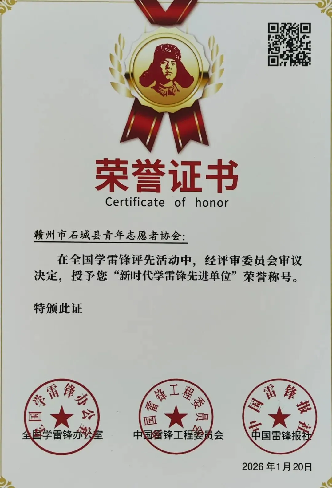 在全国学雷锋评优活动中,赣州市石城县青年志愿者协会凭借多年来对雷锋精神的坚守与践行,以及在志愿服务领域的突出贡献,经全国学雷锋办公室、中国雷锋工程委员会、中国雷锋报社联合评审,被正式授予“全国新时代学雷锋先进单位”荣誉称号。这是对协会全体志愿者无私奉献的最高褒奖,也是石城志愿服务事业发展历程中的重要里程碑。
