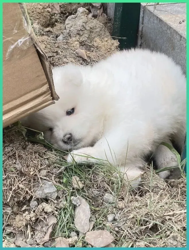 起初我以为是谁.丢弃的毛.绒玩.具,或者是装修剩下的废料。直到那个.毛团微微起伏了一下,我才意识到那是.个活.物。那是一个纸箱旁边,一只小.小的萨摩耶蜷缩.在泥土里,半个身子都藏在箱子的阴影下,像是想.把自己藏起来,又像是已经没有力气再往前爬一步。
