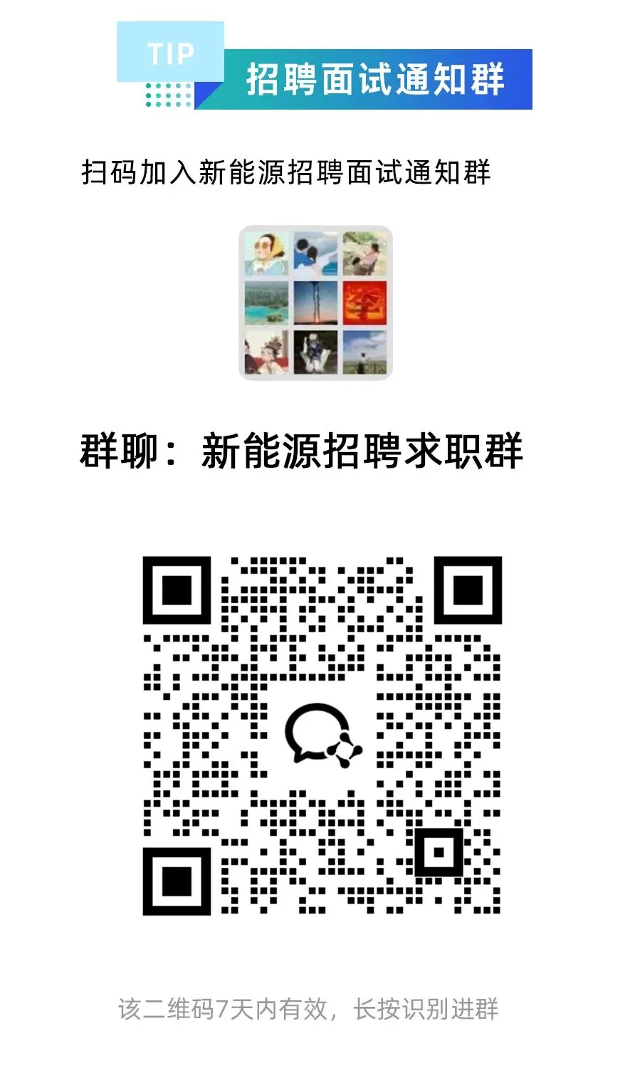 想从事新能源有关行业,或者正从事新能源工作的可以扫码进群新能源行业求职者: 专注新能源领域的人才招聘信息发布。汇聚风电、光伏、储能、氢能、核能、生物质能、新能源汽车等全产业链名企高薪职位。为行业精英赋能,为企业发展引才。绿色未来,“职”等你来!