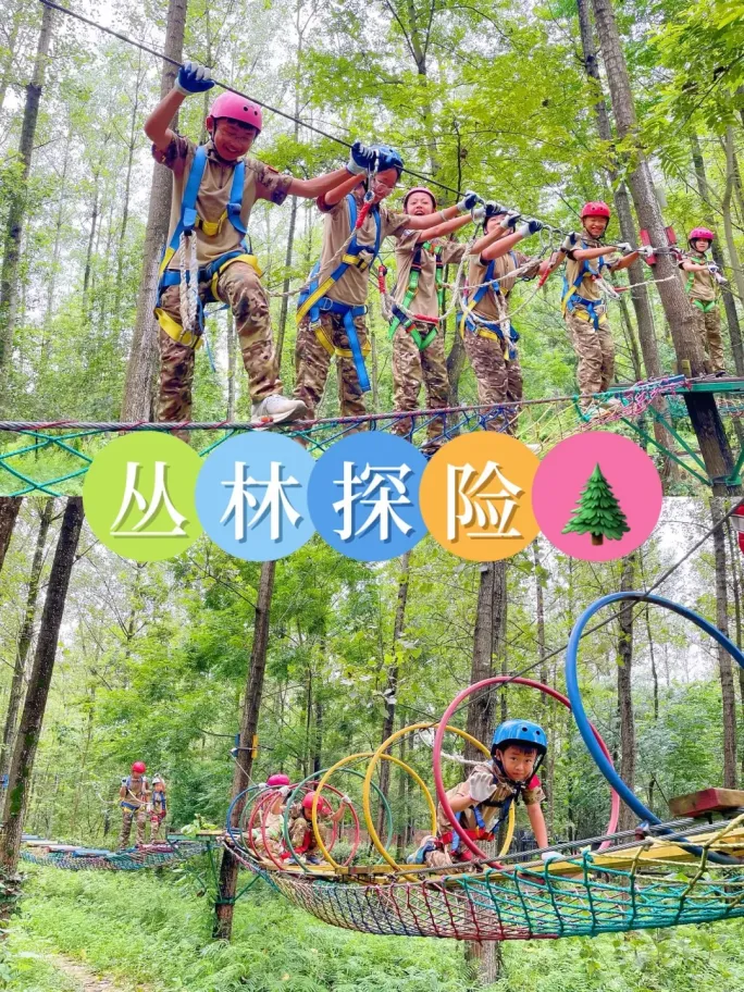 在樱花林掩映的树林间闯关,绳索、吊桥、蹦床,重走长征路等关卡刺激又安全,挑战勇气与平衡感;爬上爬下、钻洞寻宝,让小朋友尽情撒欢,解放天性。