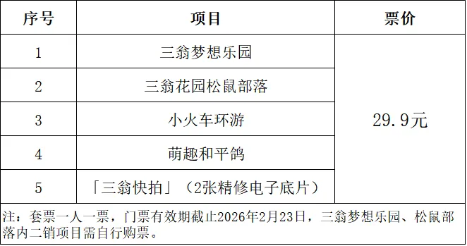 2月8日—2月23日,三翁花园推出新春专属联票,无动力乐园畅玩、萌趣喂鸽子体验、园区小火车环游,还附赠精美快拍一张,定格游园美好瞬间~