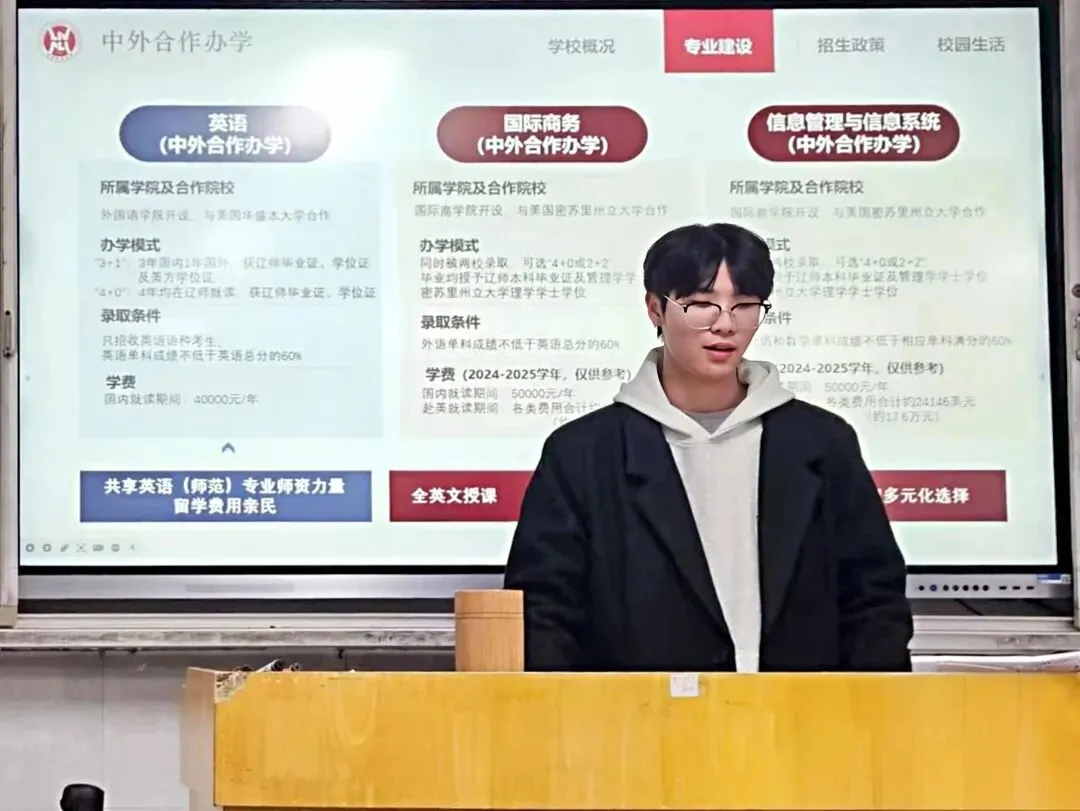 本次宣讲中,我着重介绍辽宁师范大学的校园风貌与生活环境。我用精心准备的PPT和校园实拍视频,带大家“云游”辽师。从春日繁花满枝的林荫道到藏书丰富的图书馆,从设施齐全的教学楼到温馨舒适的宿舍食堂,每一处场景都凝聚着我在辽师的美好回忆。同时,我还分享自己在大学的学习体验:课堂上与老师的思维碰撞、社团活动中的能力提升、志愿服务里的责任担当,以及和同学们并肩前行的温暖时光。我想让学弟学妹们知道,大学不仅是学习知识的殿堂,更是实现自我成长、追逐人生理想的广阔平台。