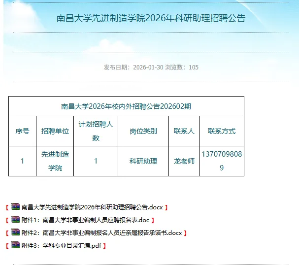 声明:本微信公众号刊载此文,无任何商业目的,纯属公益转发,目的是架起求职者和用人单位之间的桥梁,传递更多的招聘就业信息,请您找工作时候务必高度警惕各类求职陷阱。若来源标注错误或侵犯了您的合法权益,请及时与我们联系,我们将及时更正、删除或依法处理,微信号(含:商务合作):sqdzry。根据南昌大学先进制造学院工作需求,秉持“公开、平等、择优”的原则,现面向社会公开招聘科研助理人员1名(管理岗,非事业编制),具体招聘事宜如下: