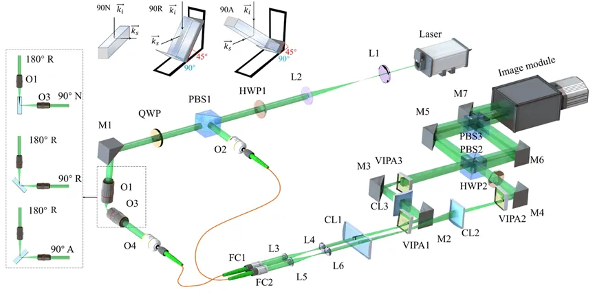 粘弹性材料的弹性模量表现出显著的频率依赖性,其力学特性可通过光子-声子散射过程进行分析。布里渊散射基于光子与声子的相互作用,通过测量散射光的频移可获取材料中的声速,进而推算出弹性模量及相关力学参数(如剪切模量、纵向模量)。这些参数被广泛应用于材料表征与生物医学诊断。布里渊显微镜检测纵向与剪切模量的能力高度依赖于散射几何结构。在现有技术中,共焦布里渊显微镜主要用于检测纵向声子;而剪切布里渊显微镜则通过特定角度收集信号,可获取纵向与横向声子信息,结合不同散射几何还可进一步计算材料的折射率。基于虚拟成像相控阵(virtually imaged phased array, VIPA)的剪切布里渊显微镜克服了早期高对比度法布里-珀罗干涉仪检测速度慢的局限,能快速测量光学玻璃的纵向和剪切弹性模量。然而,该方法仍无法实现纵向模量与剪切模量的同步测量。此外,用于折射率检测的双角度方案需使用特殊物镜,且不能同时采集两个不同角度的散射信号;其所采用的光谱仪也无法同步获取双角度下的频移。2. 创新点