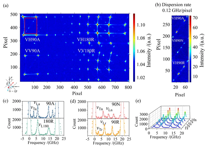图3所示为使用本系统测量晶状体纵向模量的实验结果。在400 μm的采样间隔下,采用6.08 mW的较低光功率与50–100 ms的较短积分时间获取光谱数据,进而基于频移、密度与折射率计算出平均纵向模量。结果表明,系统在低功率与短曝光条件下仍具备良好的信号检测灵敏度,为后续检测微弱的剪切信号奠定了基础。图3 离体猪眼晶状体的弹性成像图源:IEEE Transactions on Instrumentation and Measurement(2026)https://doi.org/10.1109/TIM.2026.3659607 (Fig.7)图4给出了聚苯乙烯在不同散射几何下单次测量的布里渊光谱结果。针对剪切波速度较低的特点,实验采用0.12 GHz/pixel的色散率,激光功率设置为64 mW。图4(a)与(b)展示了相同曝光时间(2 s)下不同散射几何对应的布里渊信号;图4(c)与(d)为相应的光谱分布;图4(e)则进一步比较了不同曝光时间下的光谱变化。具体频移测量结果如下:90A几何中,纵向与横向频移分别为6.18 ± 0.12 GHz和3.07 ± 0.04 GHz;90N几何中分别为10.10 ± 0.12 GHz和5.97 ± 0.09 GHz;90R几何中分别为12.70 ± 0.13 GHz和2.73 ± 0.13 GHz;180R几何中纵向频移为14.16 ± 0.11 GHz。基于90R与180R的纵向频移值,计算得到聚苯乙烯的折射率约为1.60 ± 0.01。进一步,将系统用于测量聚甲基丙烯酸甲酯,得到其在多种散射几何下的纵向模量范围为8.40–8.87 GPa,剪切模量范围为0.37–3.41 GPa,折射率为1.50 ± 0.04。以上结果共同验证了本系统能够同步、准确地检测材料的纵向模量、剪切模量及折射率。图4 聚苯乙烯布里渊光谱的单次测量结果图源:IEEE Transactions on Instrumentation and Measurement(2026)https://doi.org/10.1109/TIM.2026.3659607 (Fig.8)5. 总结与展望