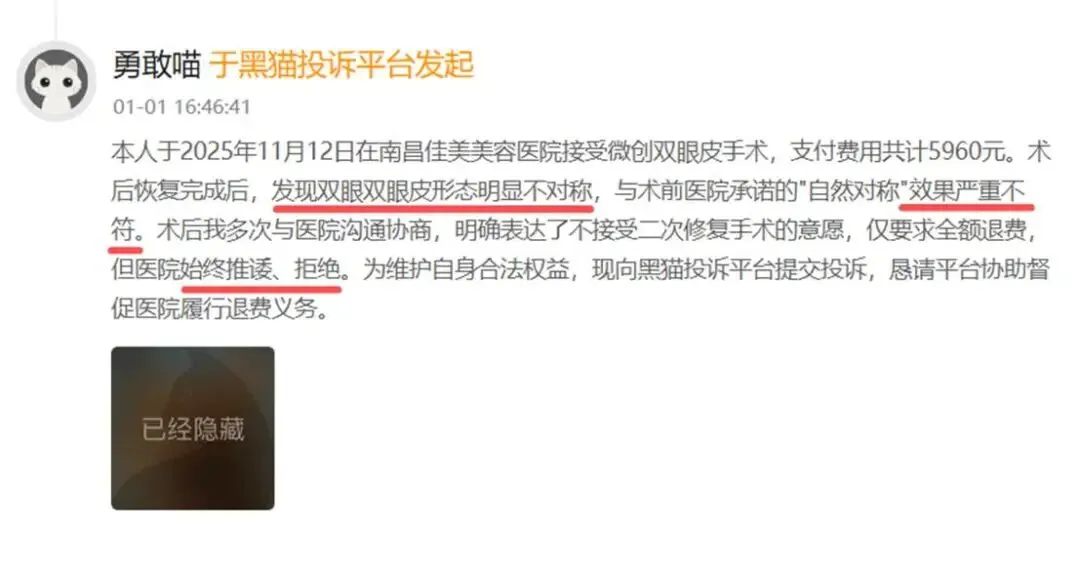 2026年1月1日,一位消费者在黑猫投诉上分享了自己在南昌佳美美容医院的痛苦经历。