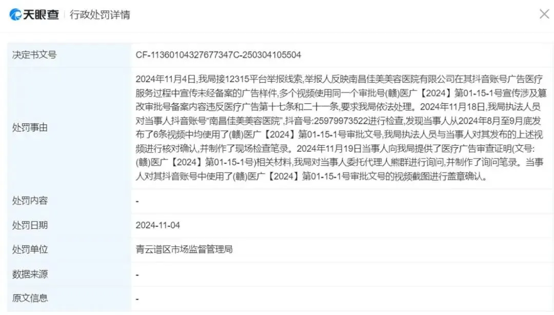 2024年11月4日,南昌佳美美容医院因违规在抖音上发布医疗广告被相关部门警告。抖音作为一个国民级的社交平台,日活超9.07亿(QuestMobile提供数据),一条虚假医疗广告可能瞬间触达千万用户。