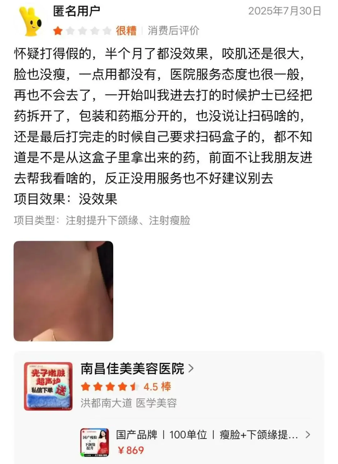 2025年7月30日,有消费者怀疑自己在南昌佳美美容医院打的是假药,因为注射已过去半个月仍无任何效果,咬肌依然很大,脸部也没有瘦下来。