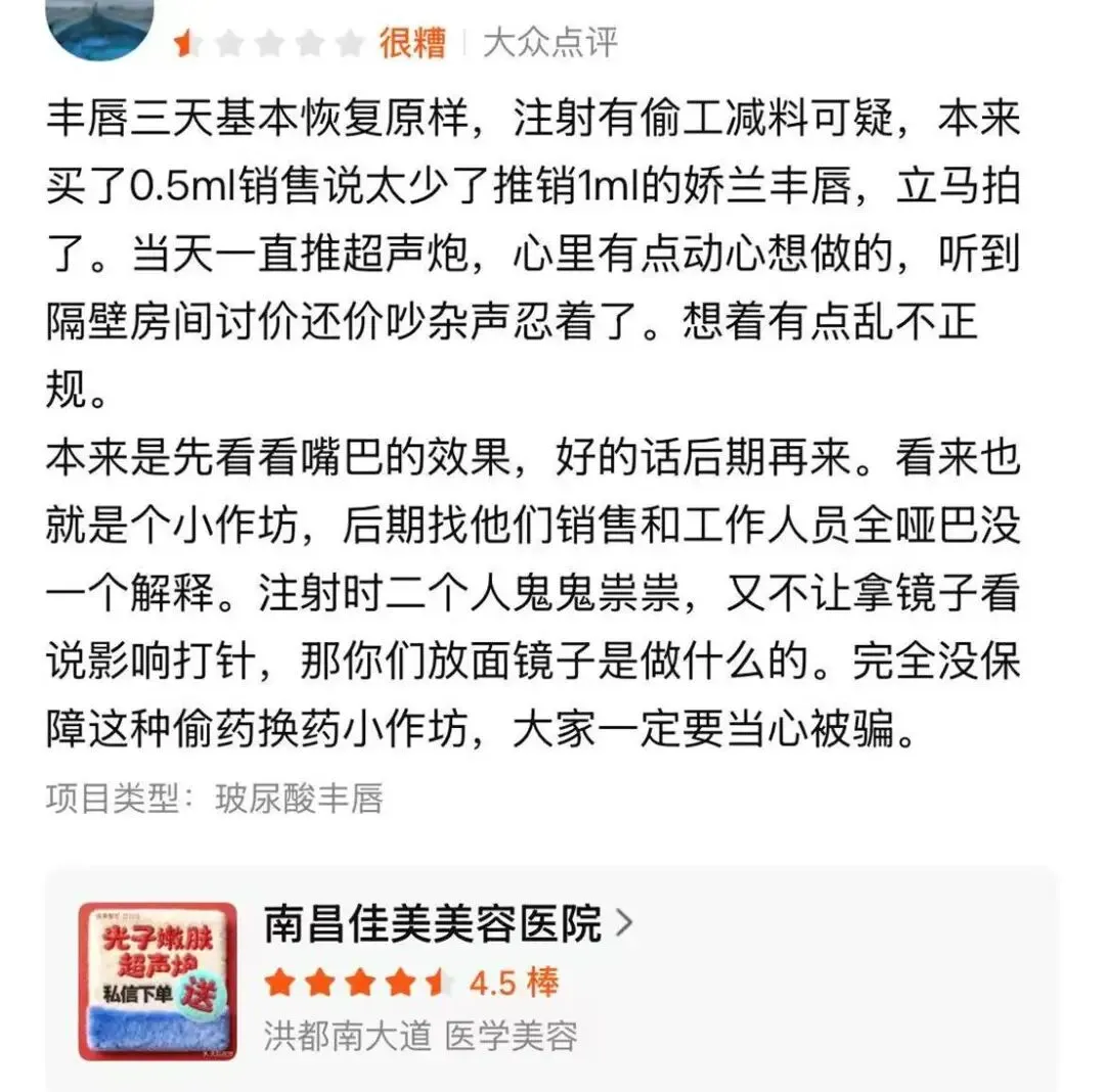一位消费者在2025年5月28日评论道,自己在该机构做的丰唇手术,仅仅三天就基本恢复原样,明显感觉注射存在偷工减料的情况。