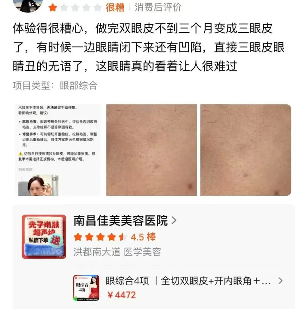 又有消费者痛斥南昌佳美美容医院医生技术差,导致自己双眼皮手术失败。