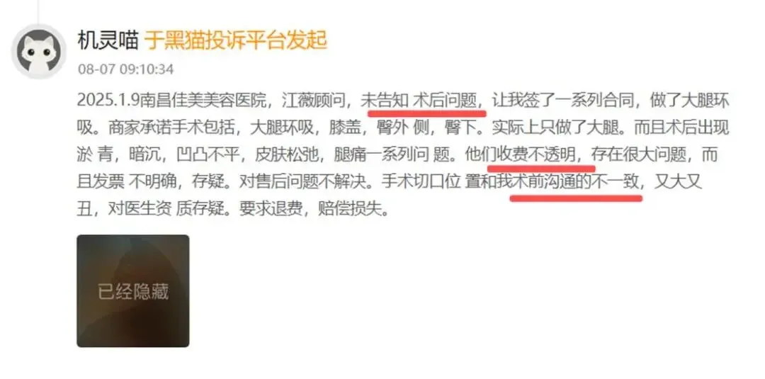 2025年8月7日,有消费者投诉称,1月9日在南昌佳美美容医院由顾问江某接待,进行大腿环吸手术。医院承诺的手术范围包括大腿环吸、膝盖、臀外侧、臀下,可实际上只做了大腿。