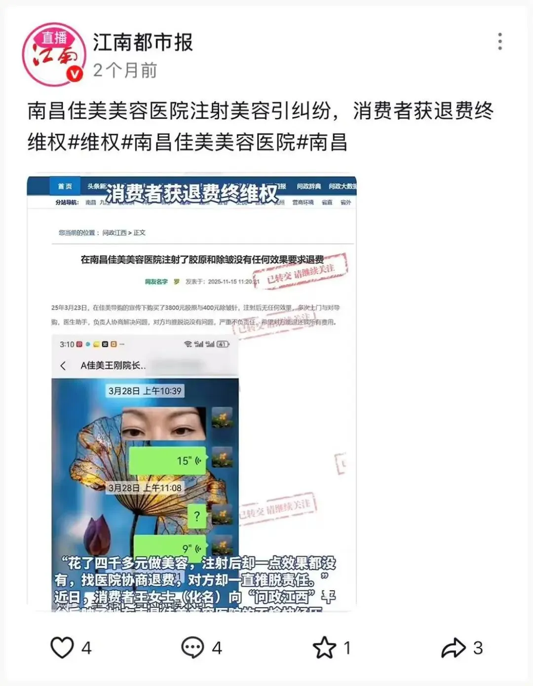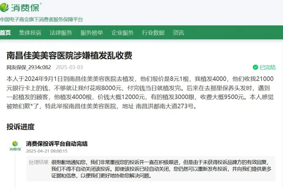 黑猫投诉平台上,也有不少消费者对南昌佳美医美进行了投诉。