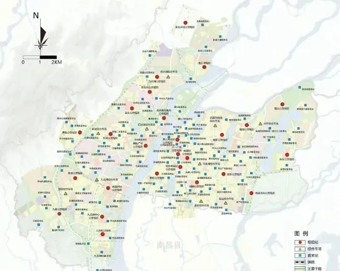 再从中心城区公交场站总体规划布局图看,其中枢纽站包括九龙湖公交枢纽、九龙湖中心公共枢纽、九望公交枢纽、望城公交枢纽、湾里公交枢纽、长堎公交枢纽、崛起广场公交枢纽、昌北公交枢纽、北外滩凤凰洲公交枢纽、新北站公交枢纽、儒乐湖枢纽、青山客运站、南昌站公交枢纽、朝阳公交枢纽、城南公交枢纽、南昌东站公交枢纽、高新公交枢纽、瑶湖公交枢纽、麻丘公交枢纽、瑶北公交枢纽。