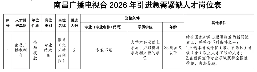 本次急需紧缺人才引进采取个人报名和组织同意相结合的方式。报名人员可在2026年1月30日上午9:00至2月9日下午16:00期间登录江西人才服务网(https://www.jxrcfw.com),点击“南昌广播电视台急需紧缺人才引进专题”,进入报名登录系统,进行网上注册报名。