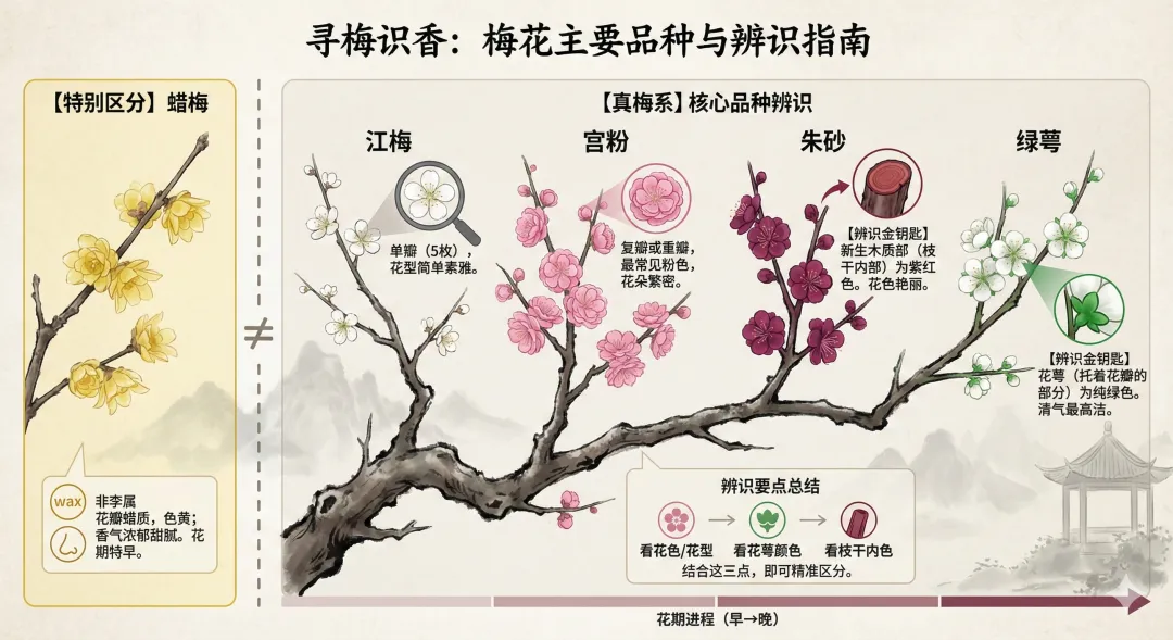 排除腊梅后,公园里最常见的梅花,主要有以下四种,区分起来并不难~