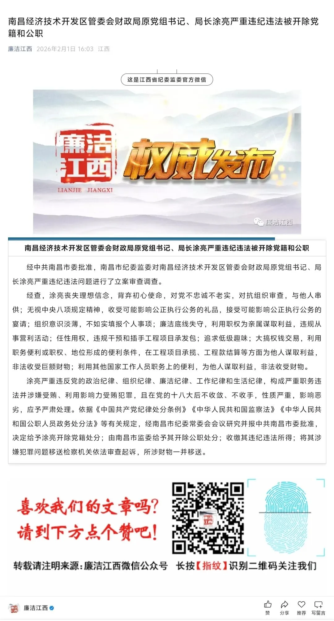 《江西省南昌经济技术开发区管委会财政局原党组书记、局长涂亮严重违纪违法被开除党籍和公职》