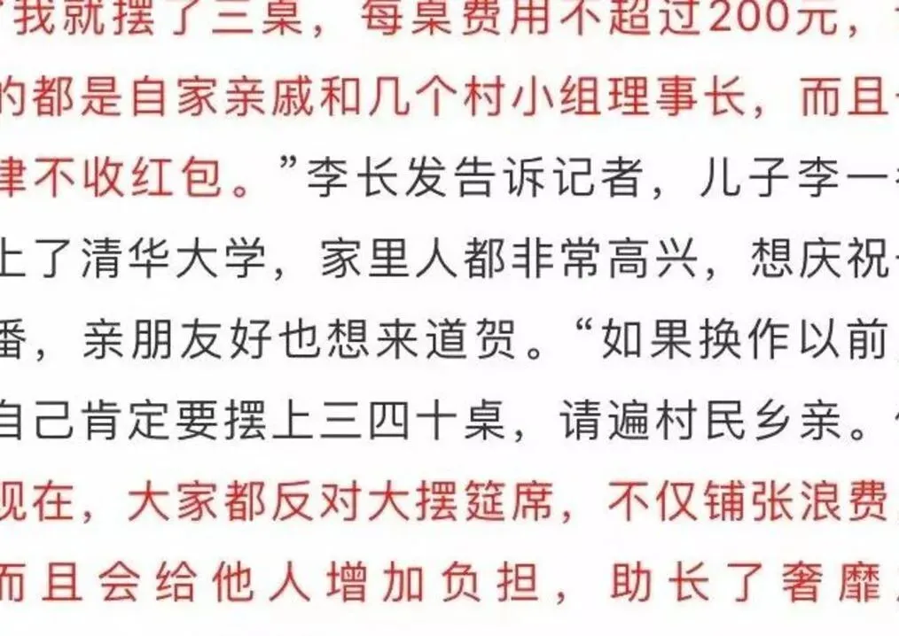 热闹可以有 但别变成敛财工具。有位家长留言说 儿子考上清华也只想请三五桌 红包一个不收。这种清新风俗 真的挺好。