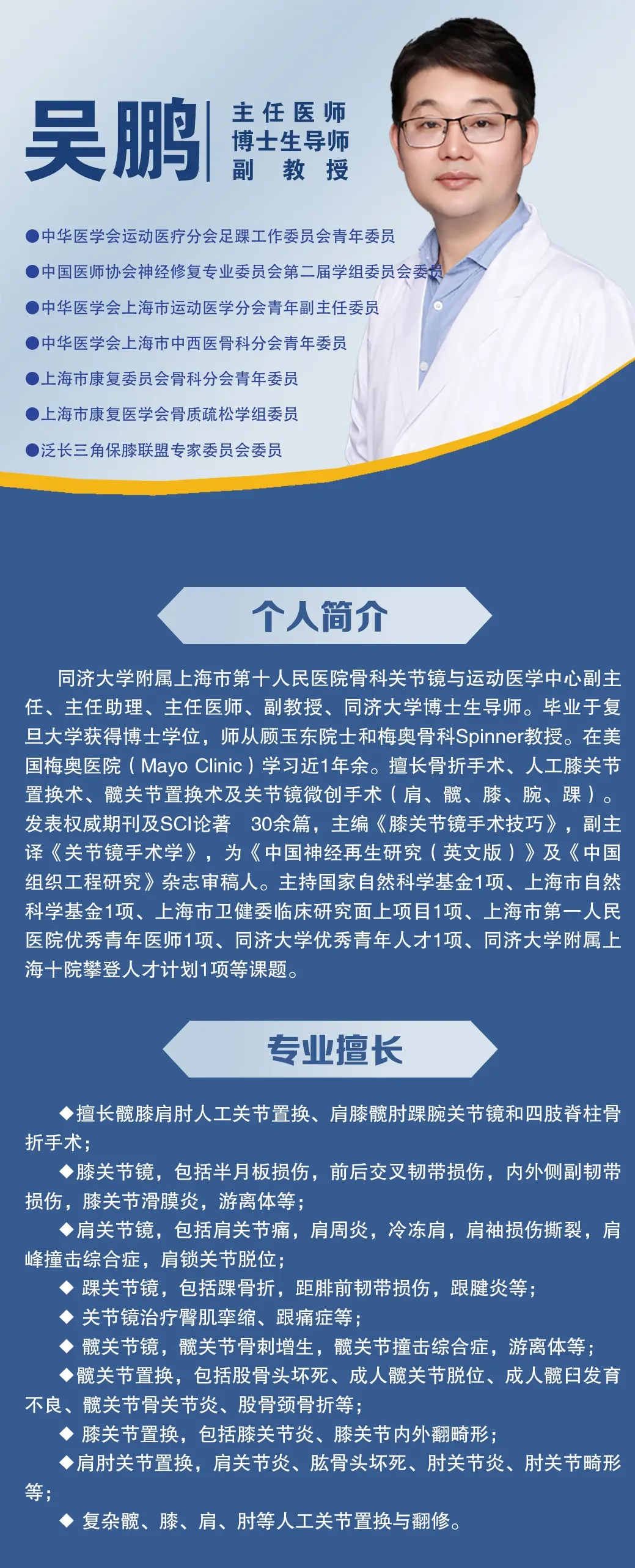 专业擅长:人工膝关节置换术、髋关节置换术、关节镜微创手术(肩、髋、膝、腕、踝)