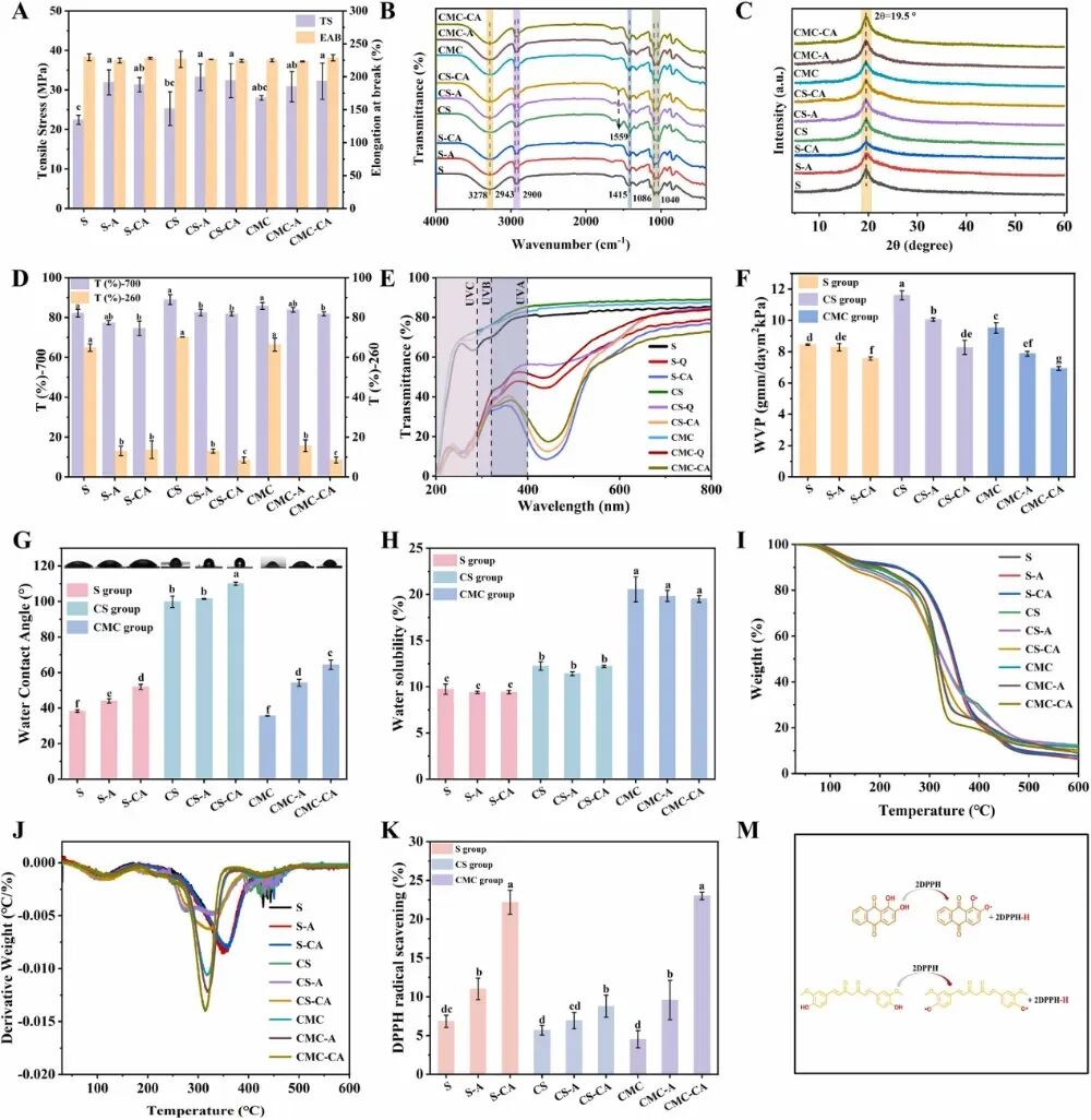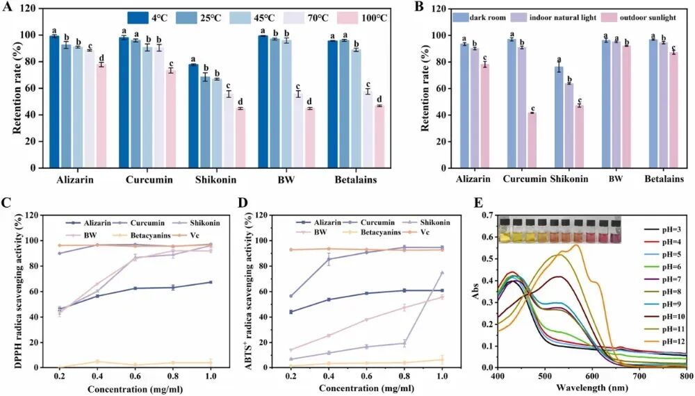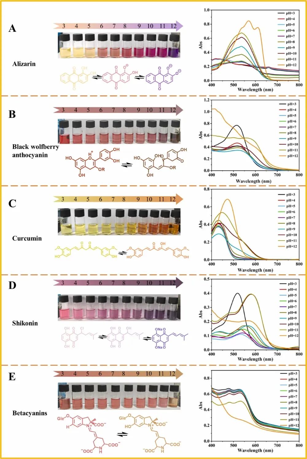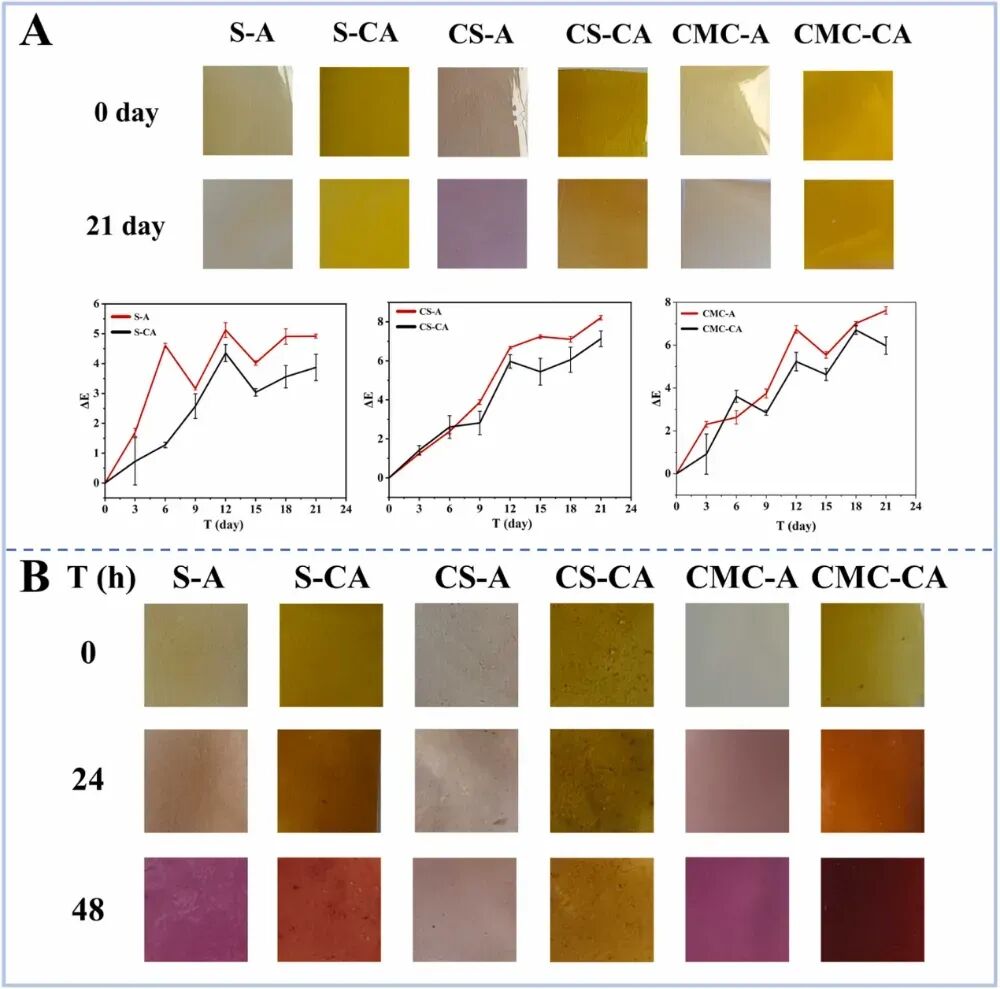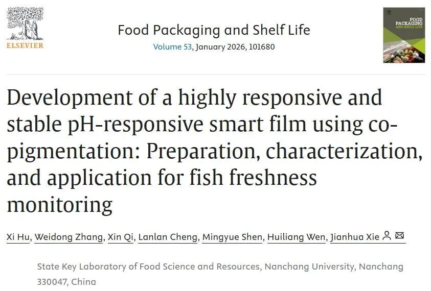 南昌大学食品科学与资源挖掘全国重点实验室谢建华教授团队在Food Packaging and Shelf Life发表题目为“Development of a highly responsive and stable pH-responsive smart film using co-pigmentation: Preparation, characterization, and application for fish freshness monitoring”研究论文(利用共颜料法开发高响应性和稳定性pH响应智能薄膜:制备、表征及其在鱼类新鲜度监测中的应用)。指示剂的有效性对于智能包装系统的准确性至关重要。然而,现有的天然颜料在显色性和长期稳定性方面存在缺陷,限制了其应用。因此,本研究通过功能互补策略开发了一种新型姜黄素-茜素复合颜料(CA)。该CA颜料被添加到各种成膜基材中,制备出高稳定性、高灵敏度的pH响应型智能包装薄膜。添加CA显著改善了薄膜的阻隔性能,紫外线屏蔽效率提高了约56%,T-260值大幅降低(<15%)。此外,CA还增强了薄膜的拉伸强度、疏水性和抗氧化活性(P<0.05)。与纯茜素薄膜相比,共着色法制备的薄膜具有更好的储存稳定性和更佳的视觉效果。所制备的智能薄膜可成功用于鲜鱼的质量监测。优化后的羧甲基纤维素(CMC)-CA薄膜在鱼类新鲜度监测方面表现出优异的综合性能,证实了我们指示剂基质选择方法的有效性。这些结果表明,CA作为一种持久且准确的食品质量监测指示剂具有巨大潜力,为构建可持续、可靠的智能包装系统提供了技术和理论支持。Fig. 1. Color response of natural pigments solutions at different pH values and their UV absorption spectra.Fig. 2. Temperature stability (A), light stability (B), and antioxidant capacity (C, D) for natural pigments solutions, pH responses and UV–vis spectra for CA solutions (E).Fig. 3. The appearance and microstructure of films.Fig. 4. Physical and chemical properties of the filmsFig. 5. The color response (A) and ΔE change (B) of the indicator films at pH 2–12. The color (C) and ΔE change (E) of the indicator films in response to ammonia, and CA reaction to ammonia vapor (D).Fig. 6. Color stability (A), the color change of the indicator films depending on pH change of fish during storage (B).https://doi.org/10.1016/j.fpsl.2025.101680