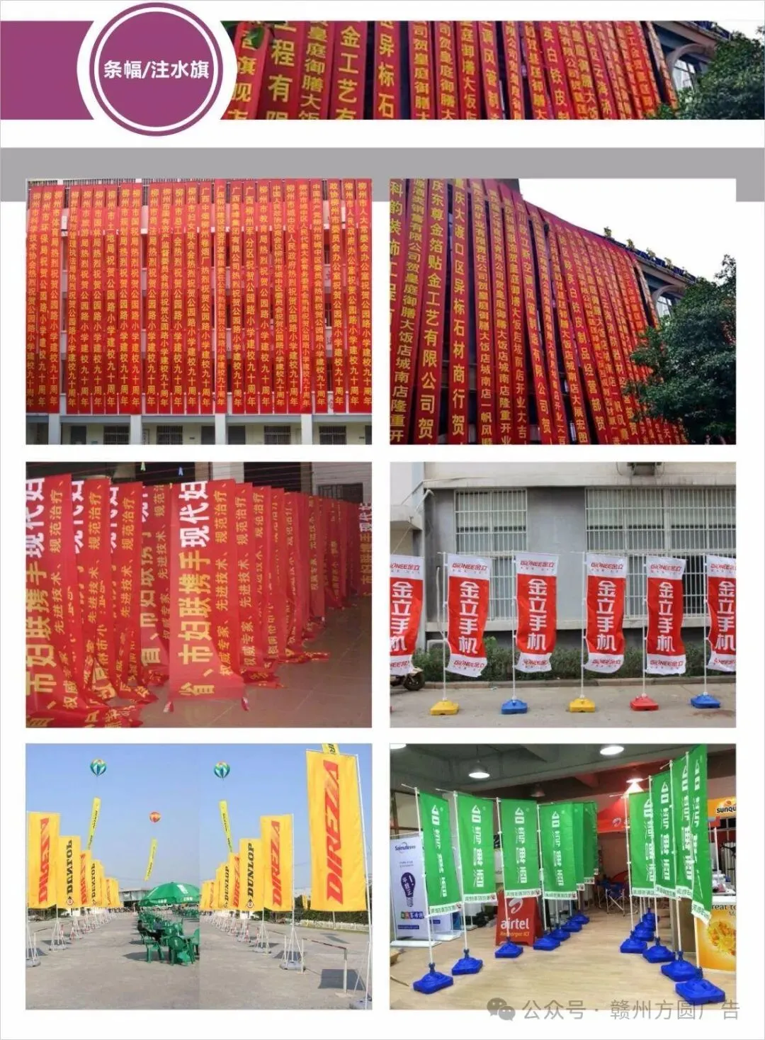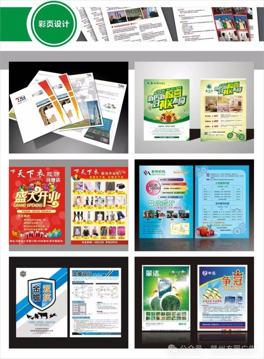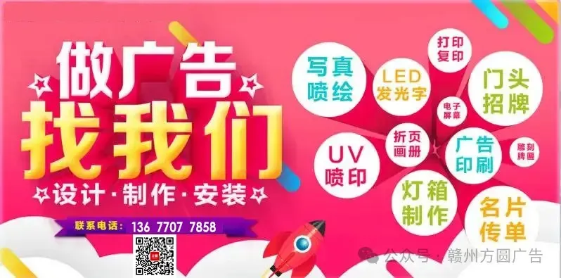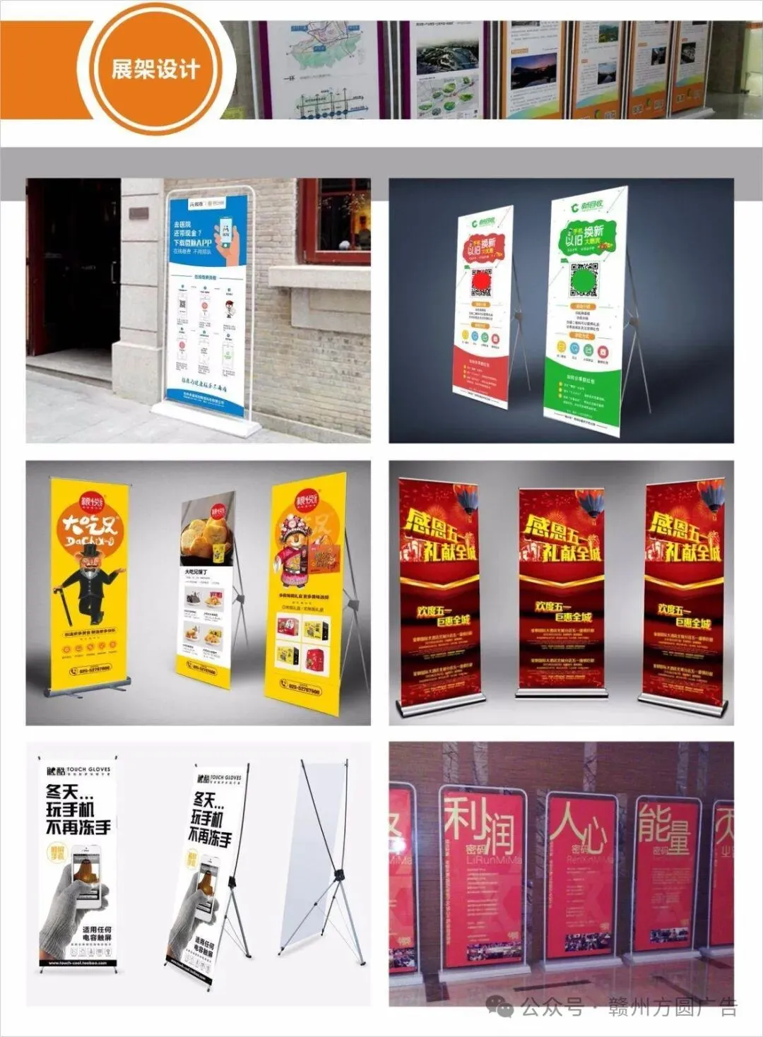 赣州广告印刷基地-最便捷的广告印刷品采购平台赣州方圆广告是一家集设计、喷绘、招牌、广告、印刷、装修为一体的优秀标杆企业!服务范围:◆ 设计印刷:画册、宣传单、名片、吊牌、手提袋、无碳纸联单、会员卡、刮刮卡、不干胶、信笺、档案袋、利是封、广告扇、纸杯◆ 室内外喷画:背胶PP、高光相纸、灯片、KT板、PVC展架画、户外背胶、灯布、卷帘、UV打印、哑展板、X展架、门型展架 、易拉宝 、拉网展架、 L型展架 、人型立架、 挂画、单孔透、软膜生产及安装◆ 招牌广告:门头招牌、企业文化背景墙、会议舞台背景墙、灯箱、路牌、水晶字、LED发光字、科室牌、显示屏、投影仪等装修工程◆ 庆典类:舞台、背景、红地毯、灯光、音箱、摄影、摄像、香花、展会绗架搭建、LED显示屏会场布置,庆典筹划执行、开业舞狮等