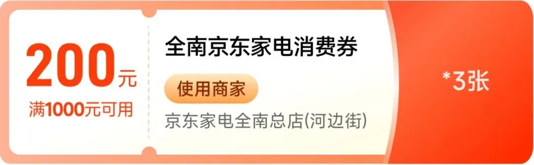 1.全南京东家电消费券:活动期间每人限领取3张满1000元减200元的消费券,最高可享受满3000元立减600元优惠。