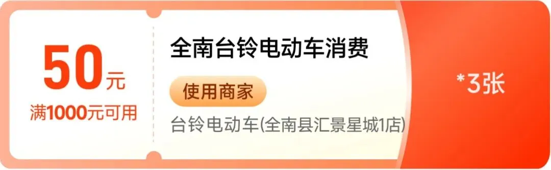 1.全南台铃电动车消费券:活动期间每人限领取3张满1000元减50元的消费券,最高可享受满3000元立减150元优惠。