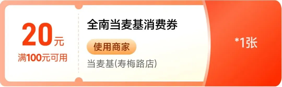 1.全南当麦基消费券(寿梅路店):活动期间每人限领取1张满100元减20元的消费券。