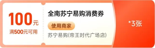 1.全南苏宁易购消费券:活动期间每人限领取3张满500元减100元的消费券,最高可享受满1500元立减300元优惠。