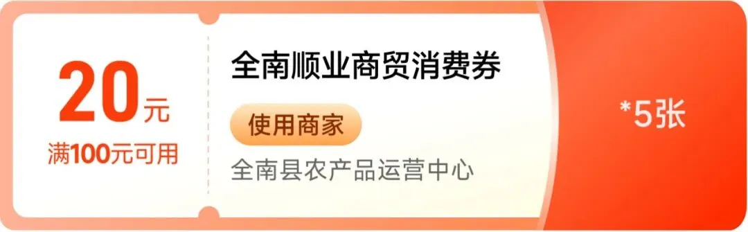 1.全南顺业商贸消费券:活动期间每人限领取5张满100元减20元的消费券,最高可享受满500元立减100元优惠。