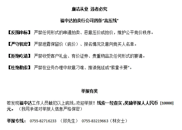 有意者须在2026年2月4日17时前将拍卖保证金通过银行转账方式转账到拍卖人指定账户(户名:广东福中达拍卖行有限公司,账号:11014552888880,开户行:平安银行深圳江苏大厦支行),以到账为准,转账附言栏须注明拍卖保证金,竞买人报名名称与缴纳保证金名称必须一致,办理网络拍卖竞买资格确认手续,逾期的恕不接受报名及确认竞买资格,其他拍卖详情请参阅《拍卖文件》。