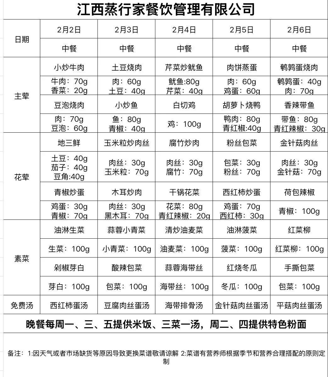 南昌二中丹霞路校区一周校园营养食谱2月2日—2月6日