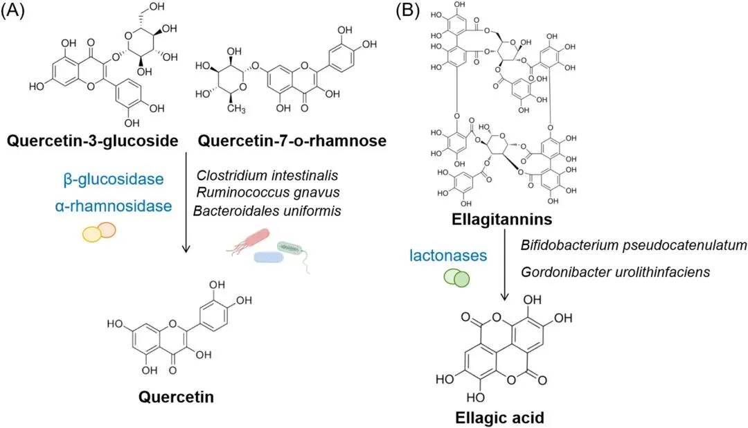 Strains and enzymes involved in polyphenol degradation metabolism in the colon. For example, quercetin-3-glucoside (left) and quercetin-7-O-rhamnoside (right) are shown in the figure.