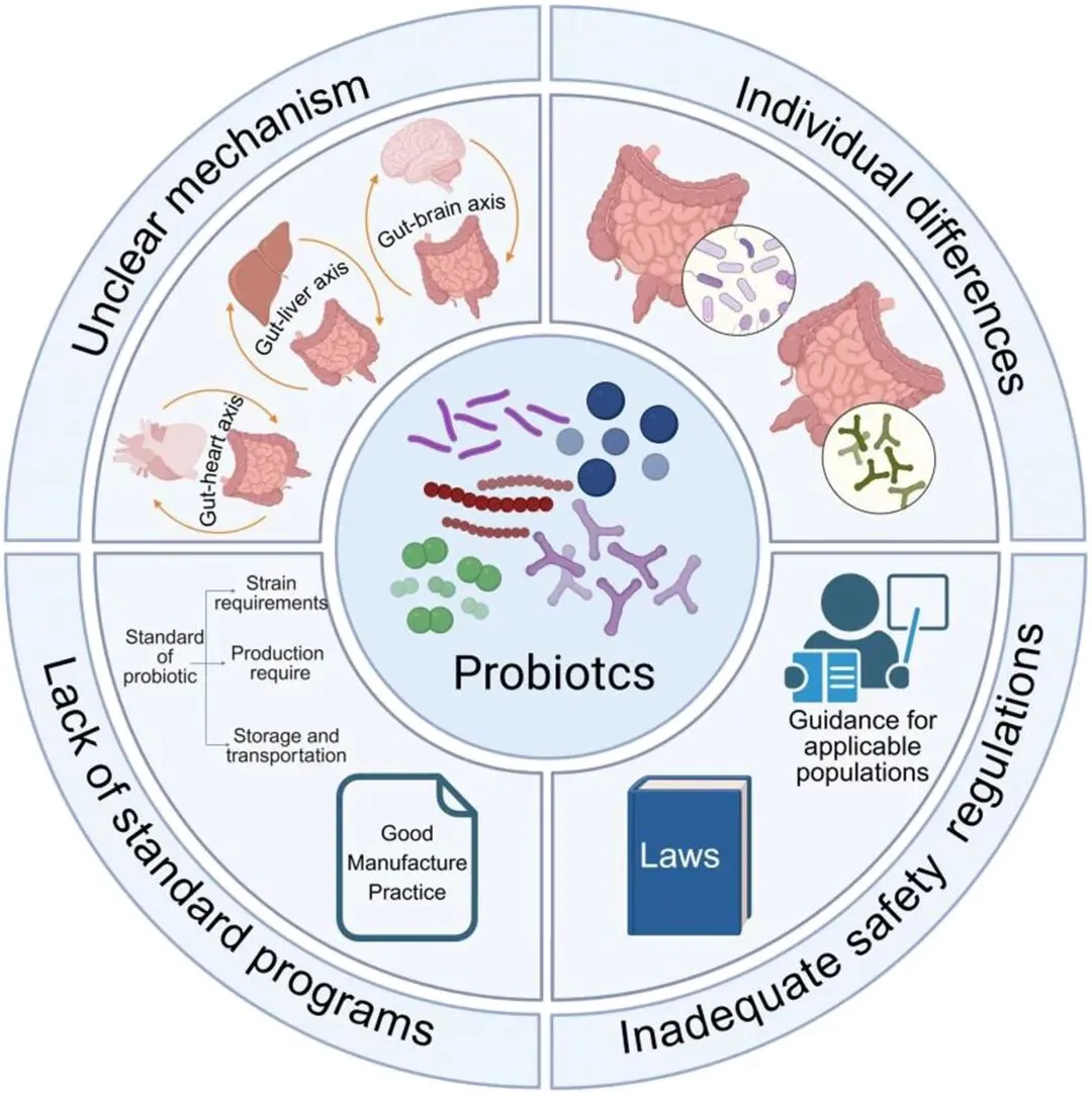 Challenges of polyphenol-biotics products. The research mechanism of the impact of polyphenols and functional bacteria on disease, and the regulation between the gut-brain axis, gut-liver axis and gut-heart axis is not clear yet. The microbial metabolism of polyphenols has obvious individual differences, and the different composition of the gut microbiota leads to different polyphenol conversion and metabolism rates. In the production of probiotic preparations, there is a lack of standardized production and quality management norms as a guideline. In terms of market and regulation, there is no standard to describe the applicable population, and lack of mandatory laws.