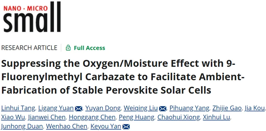 Linhui Tang, Ligang Yuan*, Yuyan Dong, Weiqing Liu*, Pihuang Yang, Zhijie Gao, Jia Kou, Xiao Wu, Jianwei Chen, Honggang Chen, Peng Huang, Chaohui Xiong, Xinhui Lu, Junhong Duan, Wenhao Chen, Keyou Yan*,“Suppressing the Oxygen/Moisture Effect with 9-Fluorenylmethyl Carbazateto Facilitate Ambient-Fabrication of Stable Perovskite Solar Cells,” Small, 2026, e14927.https://onlinelibrary.wiley.com/doi/10.1002/smll.202514927