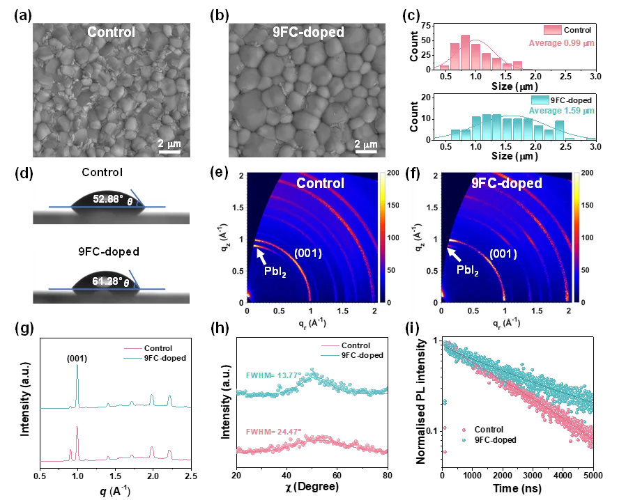 通过SEM和GIWAXS分析发现(图2a-h),9FC掺杂的钙钛矿薄膜形貌更为均匀,晶粒尺寸显著增大,结晶质量得到有效提升且表现出更好的择优晶体取向,这有利于提升电荷传输效率并抑制电荷复合。同时,图2i的TRPL光谱显示,9FC掺杂有效抑制了钙钛矿薄膜中的非辐射复合。图2 (a)对照组与(b)0.5 mg/mL 9FC掺杂钙钛矿薄膜SEM图像。(c)对照组与9FC掺杂钙钛矿薄膜的晶粒尺寸分布统计图。(d)对照组与9FC掺杂钙钛矿薄膜的水接触角图像。(e-f)GIWAXS图谱及(g)对应的GIWAXS强度分布曲线与(h)沿(001)衍射环的极角强度分布曲线。(i)TRPL光谱。图源:Small(2026).(Figure 2)3.3 9FC对钙钛矿薄膜生长的调控