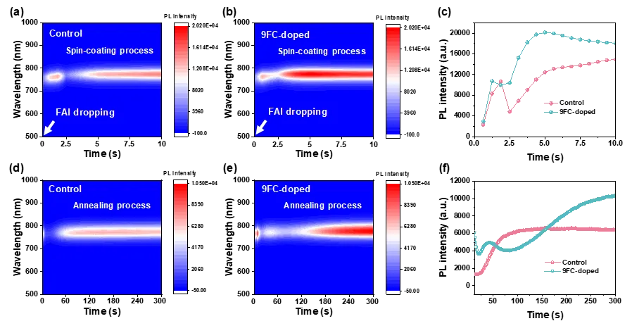 通过原位PL技术研究了9FC对钙钛矿薄膜生长过程的影响。如图3a-c所示,对于9FC掺杂的钙钛矿薄膜,旋涂过程中PL峰强度的下降现象得到显著抑制。这得益于9FC与PbI2之间的强相互作用,稳定了钙钛矿的成核相。同时,整个旋涂过程中,9FC掺杂薄膜始终保持比对照组更高的PL峰强度。此外,退火过程的数据(图3d-f)显示,9FC掺杂薄膜达到最大PL峰强度的时间更久。这表明9FC延缓了钙钛矿的结晶动力学过程,从而有利于形成更高质量的最终钙钛矿薄膜(图3a与b)。图3 两步法钙钛矿薄膜制备过程中的in-situ PL表征。(a)对照与(b)9FC掺杂钙钛矿薄膜在滴加FAI前驱体后的PL图像。(c)旋涂过程中PL峰值强度随时间的变化曲线。钙钛矿薄膜在150°C热台上退火过程的PL图像:(d)对照组与(e)9FC掺杂钙钛矿薄膜。(f)旋涂结束后热退火过程中PL峰值强度随退火时间的变化曲线。图源:Small(2026), e14927.(Figure 3)3.4 器件性能分析