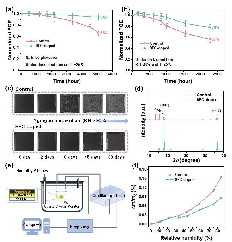 为评估9FC掺杂对器件稳定性的影响,对未封装器件进行了长期存放测试。在氮气中储存5000小时及在20%-40%湿度下存放2280小时,9FC掺杂器件仍然分别保持初始效率的94%和78%(图5a-b)。稳定性提升归因于9FC改善薄膜质量、抑制碘离子氧化并增强疏水性。进一步将薄膜置于90% RH黑暗环境中进行湿度老化实验(图5c),9FC掺杂后的样品在30天后仍保持黑色,相应XRD图谱(图5d)也证实其结构稳定性更好。石英晶体微天平(QCM)结果显示(图5 e-f),在84% RH环境中,9FC掺杂薄膜的质量变化显著更低。以上结果表明,9FC有效提升了薄膜耐湿性,为在潮湿环境中制备高效PSCs提供了可行途径。图5(a)器件在25°C氮气手套箱中储存;(b)器件在RH=20%-40%储存。(c)对照与9FC掺杂钙钛矿薄膜在相对湿度90%的空气环境中老化后的光学照片;(d)薄膜老化30天后的XRD图谱;(e)QCM测试示意图;(f)对照与9FC掺杂钙钛矿薄膜在不同相对湿度下的相对质量变化率曲线。图源:Small(2026).(Figure 5)4. 总结与展望