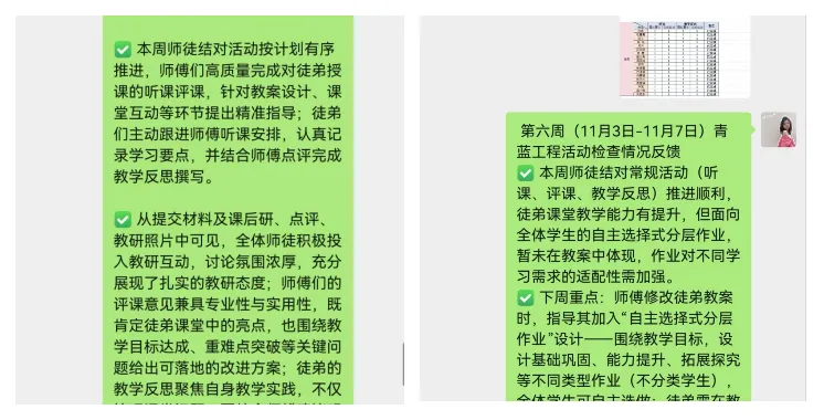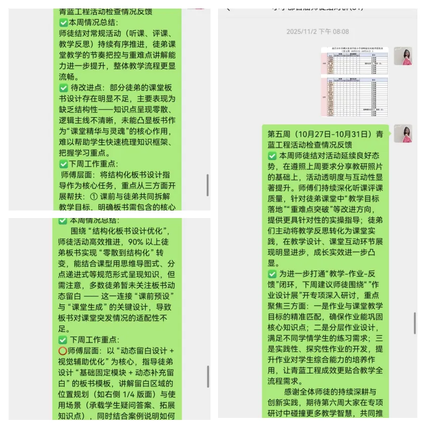 我校将每周打卡纳入师徒结对的常规管理,明确要求徒弟按时完成师父课堂的听课记录整理与上传;同步归集师父听徒弟授课所用的教案文本,以及徒弟结合师父点评撰写的课后反思材料。为进一步强化打卡实效、精准赋能成长,教务处建立每周反馈总结机制,安排专人对当周所有师徒提交的听课记录、教案文本、课后反思等材料进行全面梳理与细致审阅。这种“材料提交—专人审阅—总结反馈—整改提升”的全流程管理,与原本的成长档案形成闭环联动,让“听课—实践—反思—提升”的成长路径更具指导性和实效性,为青年教师的专业进阶筑牢根基。