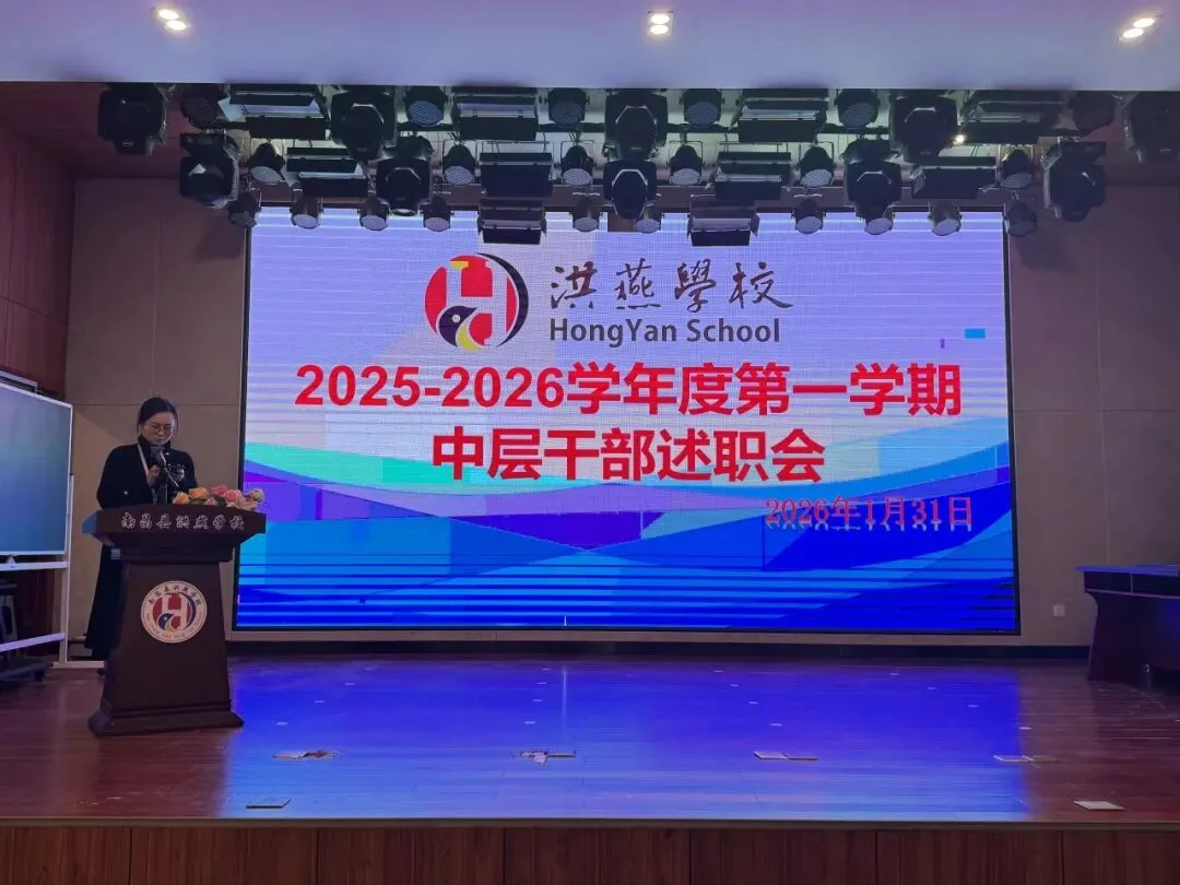 为全面复盘2025-2026学年度第一学期各项工作落实情况,进一步强化中层干部履职担当意识,凝聚学校高质量发展的强大合力,1月31日下午,洪燕学校2025-2026学年度第一学期中层干部述职会在学术报告厅举行。党总支副书记、校长赵辉,副校长王云燕、副校长黄芝龙、副校长龚剑、副校长蒋云贵出席会议,全体中层干部、年级组长参会。