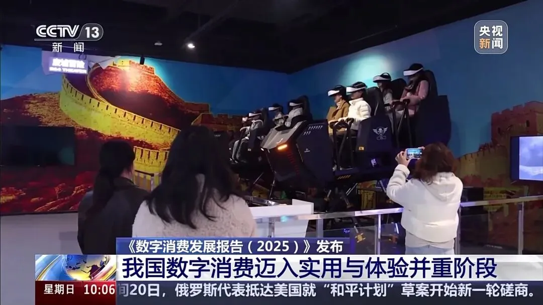 今天,央视《新闻直播间》《新闻30分》多栏目报道:戴上XR头显“走进”沉睡千年的秦陵地宫,或是在VR体验馆感受丛林蹦极的刺激……如今,这些沉浸式数字体验正丰富着我们的生活。《报告》显示,我国数字消费已迈入实用与体验并重的阶段,消费者既追求高性价比,也愿意为“悦己”和新鲜感付费,推动线上“快”购物与线下“慢”体验交融共生。